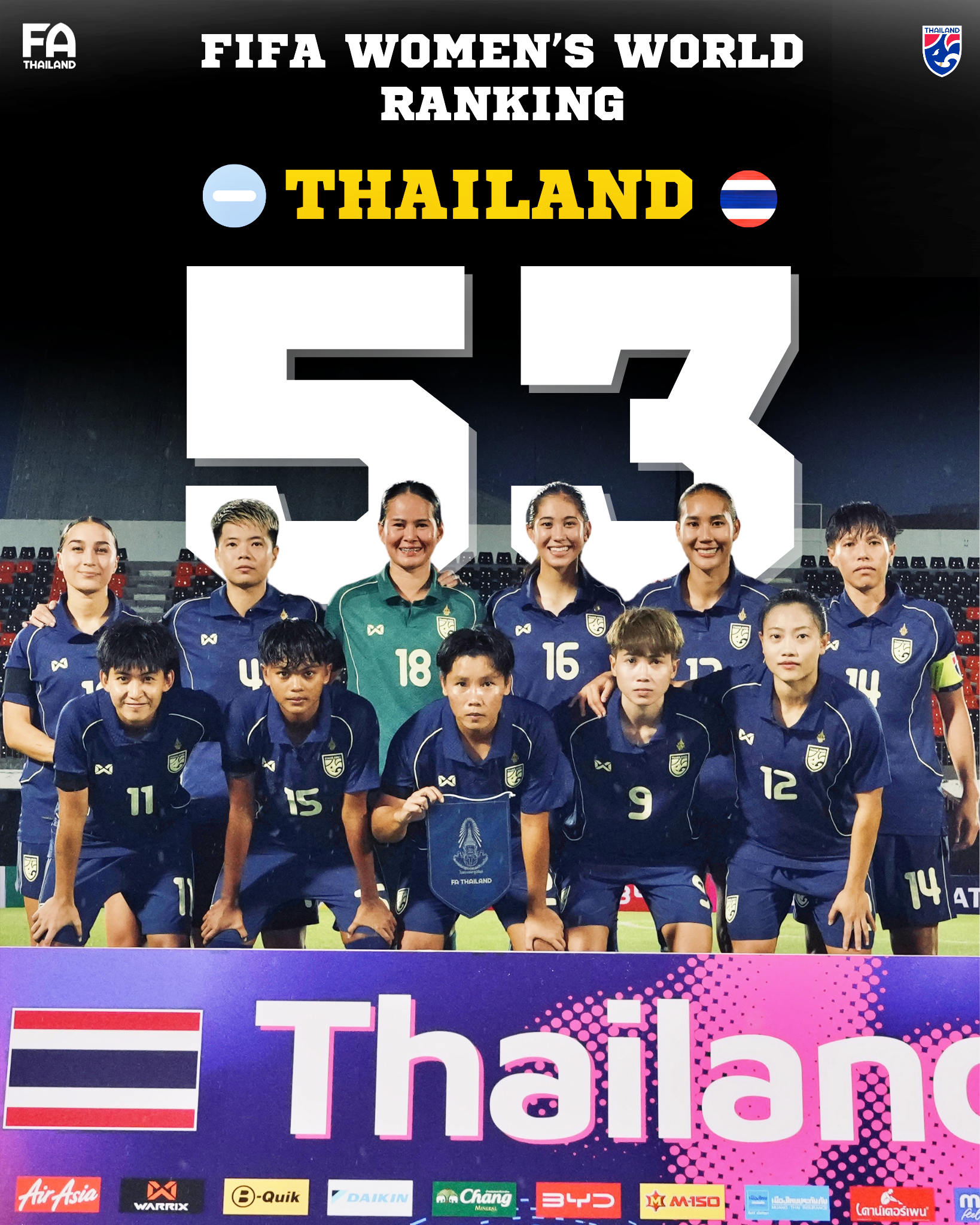 สำหรับฟุตบอลหญิงทีมชาติไทย ในการประกาศก่อนหน้านี้เมื่อเดือน สิงหาคม 2568 รั้งอยู่อันดับ 53 ของโลก ก่อนที่ในช่วงผ่านมาได้ลงสนามในรายการชิงแชมป์อาเซียน 2025 จำนวน 5 นัด ชนะ อินโดนีเซีย 7-0, ชนะ กัมพูชา 7-0, แพ้ เวียดนาม 0-1 และ แพ้ เมียนมา 1-2, แพ้ เวียดนาม 1-3 รวมถึงลงอุ่นเครื่อง 2 นัด ชนะ บังคลาเทศ 3-0, ชนะ บังคลาเทศ 5-1 และ ลงแข่งขันซีเกมส์ 2025 ชนะ อินโดนีเซีย 8-0 และ ชนะ สิงคโปร์ 2-0