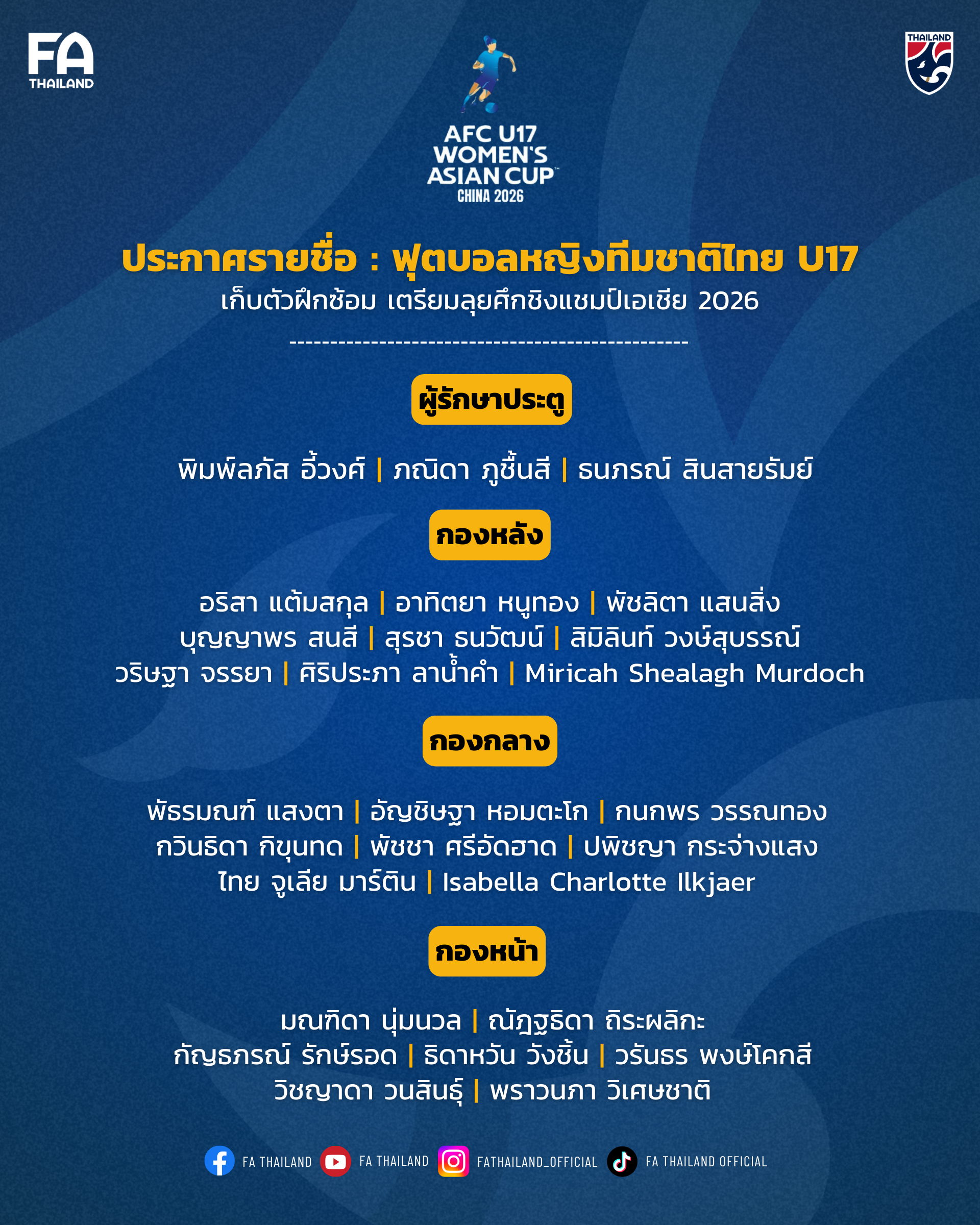 สมาคมกีฬาฟุตบอลแห่งประเทศไทย ในพระบรมราชูปถัมภ์ ประกาศรายชื่อ 27 นักฟุตบอลหญิงทีมชาติไทย รุ่นอายุไม่เกิน 17 ปี เพื่อเก็บตัวฝึกซ้อม เตรียมความพร้อมก่อนทำการแข่งขันฟุตบอลหญิงชิงแชมป์เอเชีย รุ่นอายุไม่เกิน 17 ปี 2026 (AFC U17 Women's Asian Cup China 2026) ระหว่างวันที่ 1-17 พฤษภาคม 2569 ณ เมืองซูโจว สาธารณรัฐประชาชนจีน ภายใต้การคุมทัพของ "โค้ชมิ่ม" ธิดารัตน์ วิวาสุขุ หัวหน้าผู้ฝึกสอน