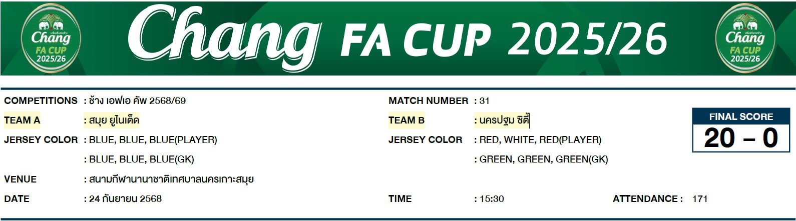 7. การแข่งขันกีฬาฟุตบอลรายการช้าง เอฟเอ คัพ (รอบคัดเลือก) วันที่ 24 กันยายน 2568 คู่ระหว่างสโมสรสมุย ยูไนเต็ด พบ สโมสรนครปฐม ซิตี้
