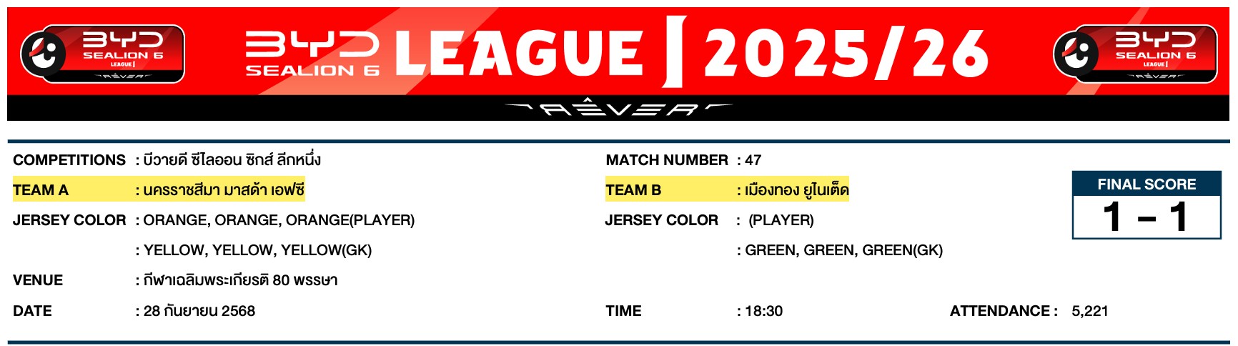 4. การแข่งขันกีฬาฟุตบอลลีกอาชีพรายการ บีวายดี ซีไลออน ซิกส์ ลีกหนึ่ง วันที่ 28 กันยายน 2568คู่ระหว่างสโมสรนครราชสีมา มาสด้า เอฟซี พบ สโมสรเมืองทอง ยูไนเต็ด