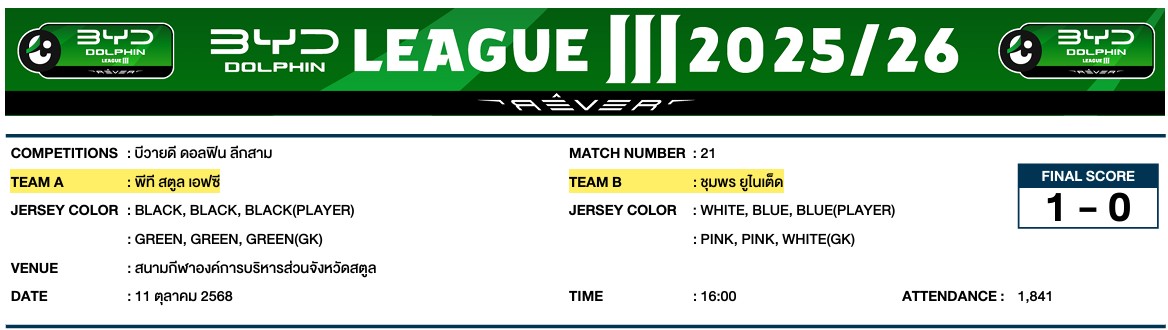 2. การแข่งขันกีฬาฟุตบอลลีกอาชีพรายการบีวายดี ดอลฟิน ลีกสาม วันที่ 11 ตุลาคม 2568 คู่ระหว่างสโมสรพีที สตูล เอฟซี พบ สโมสรชุมพร ยูไนเต็ด (สโมสรพีที สตูล เอฟซี ร้องเรียนมา 2 เหตุการณ์)