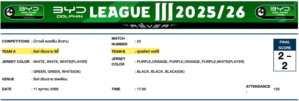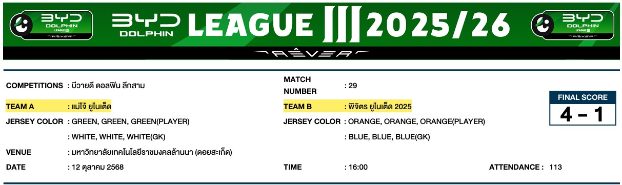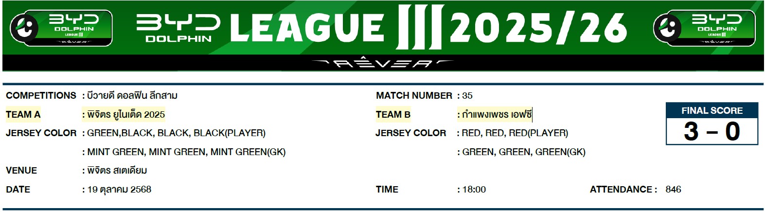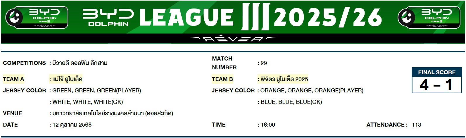 6. การแข่งขันกีฬาฟุตบอลรายการบีวายดี ดอลฟิน ลีกสาม วันที่ 12 ตุลาคม 2568 คู่ระหว่างสโมสรแม่โจ้ ยูไนเต็ด พบ สโมสรพิจิตร ยูไนเต็ด 2025