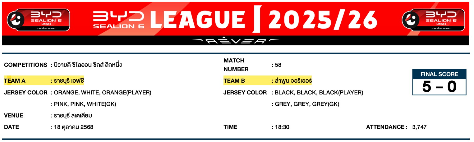 4. การแข่งขันกีฬาฟุตบอลลีกอาชีพรายการบีวายดี ซีไลออน ซิกส์ ลีกหนึ่ง วันที่ 18 ตุลาคม 2568 คู่ระหว่างสโมสรราชบุรี เอฟซี พบ สโมสรลำพูน วอริเออร์