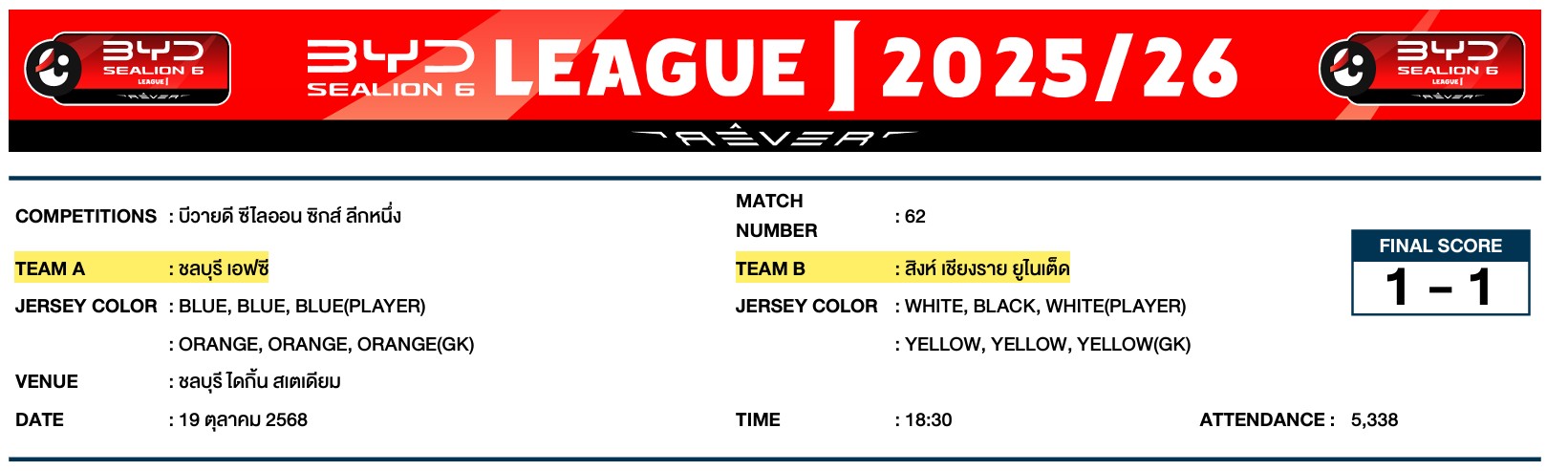 5. การแข่งขันกีฬาฟุตบอลลีกอาชีพรายการบีวายดี ซีไลออน ซิกส์ ลีกหนึ่ง วันที่ 19 ตุลาคม 2568 คู่ระหว่างสโมสรชลบุรี เอฟซี พบ สโมสรสิงห์ เชียงราย ยูไนเต็ด
