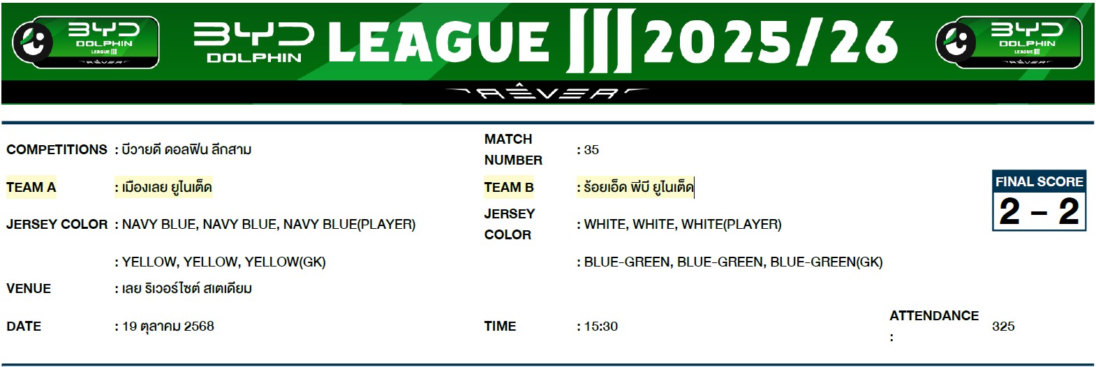 8. การแข่งขันกีฬาฟุตบอลรายการบีวายดี ดอลฟิน ลีกสาม วันที่ 19 ตุลาคม 2568 คู่ระหว่างสโมสรเมืองเลย ยูไนเต็ด พบ สโมสรร้อยเอ็ด พีบี ยูไนเต็ด