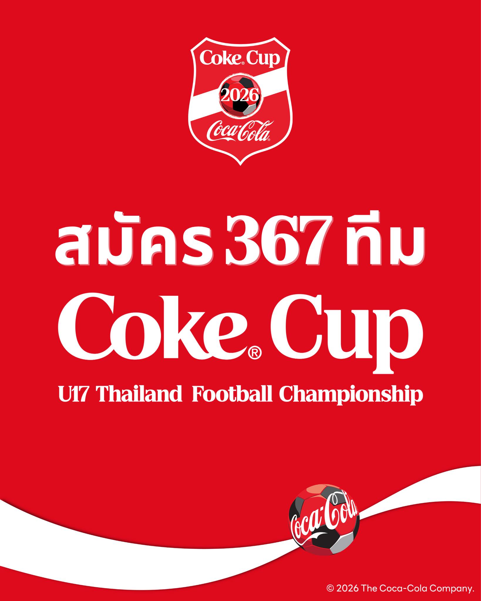 ฟุตบอลเยาวชน รุ่นอายุไม่เกิน 17 ปี “โค้ก คัพ” Coke Cup U-17 THAILAND CHAMPIONSHIP 2026 ได้รับความสนใจอย่างมาก โดยมีทีมจากสโมสร, อคาเดมี่ และสถานบันการศึกษาจากทั่วประเทศ ยื่นใบสมัครรวมทั้งหมด 367 ทีม