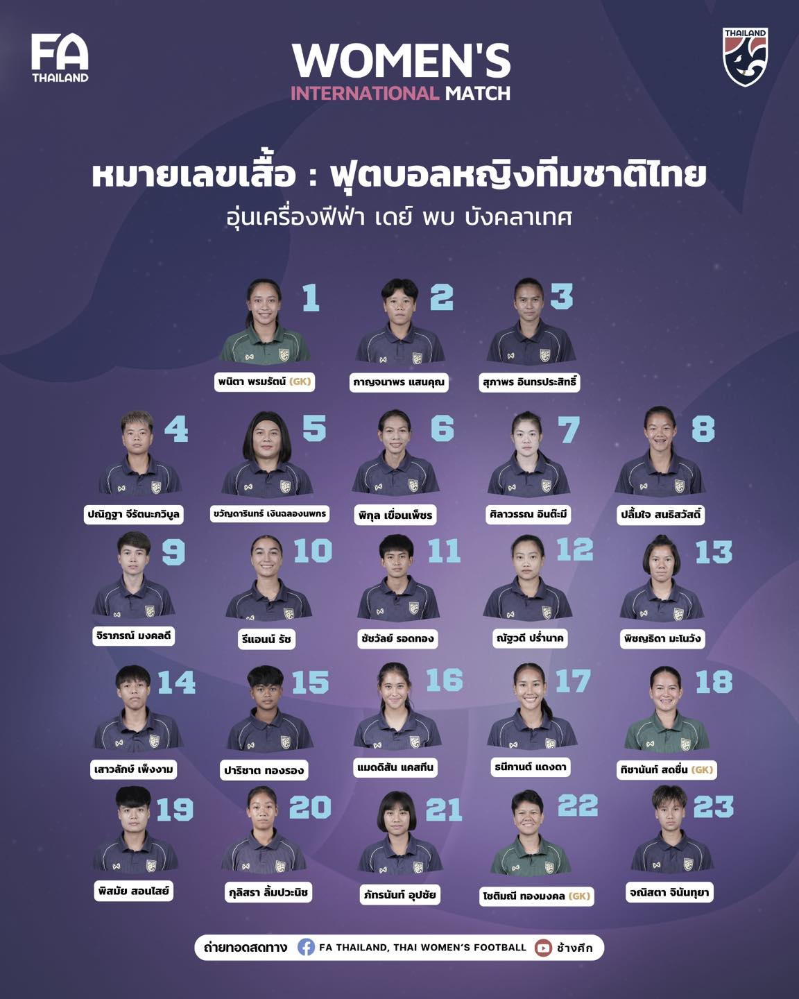 ฟุตบอลหญิงทีมชาติไทย ประกาศหมายเลขเสื้อ นักกีฬาทั้ง 23 คน ที่จะมีชื่อเตรียมลงทำการแข่งขันฟุตบอลอุ่นเครื่องตามปฏิทิน ฟีฟ่า เดย์ เดือนตุลาคม รายการWomen's International Match พบกับ ทีมชาติบังคลาเทศ ในวันที่ 27 ตุลาคม 2568 ณ สนามกีฬาเฉลิมพระเกียรติ บางมด