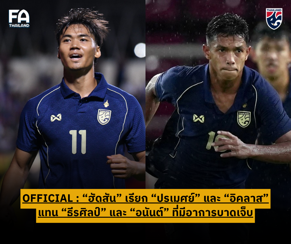 อย่างไรก็ตามล่าสุดทั้งสองคน ต่างมีอาการบาดเจ็บ จากการลงสนามในเกม ไทยลีก 1 แมตช์เดย์ล่าสุด ทำให้ทีมชาติไทยได้เรียก อิคลาส สันหรน และ ปรเมศย์ อาจวิไล มาแทนเป็นที่เรียบร้อย และจะเดินทางมารายงานตัวในวันที่ 10 พฤศจิกายน นี้