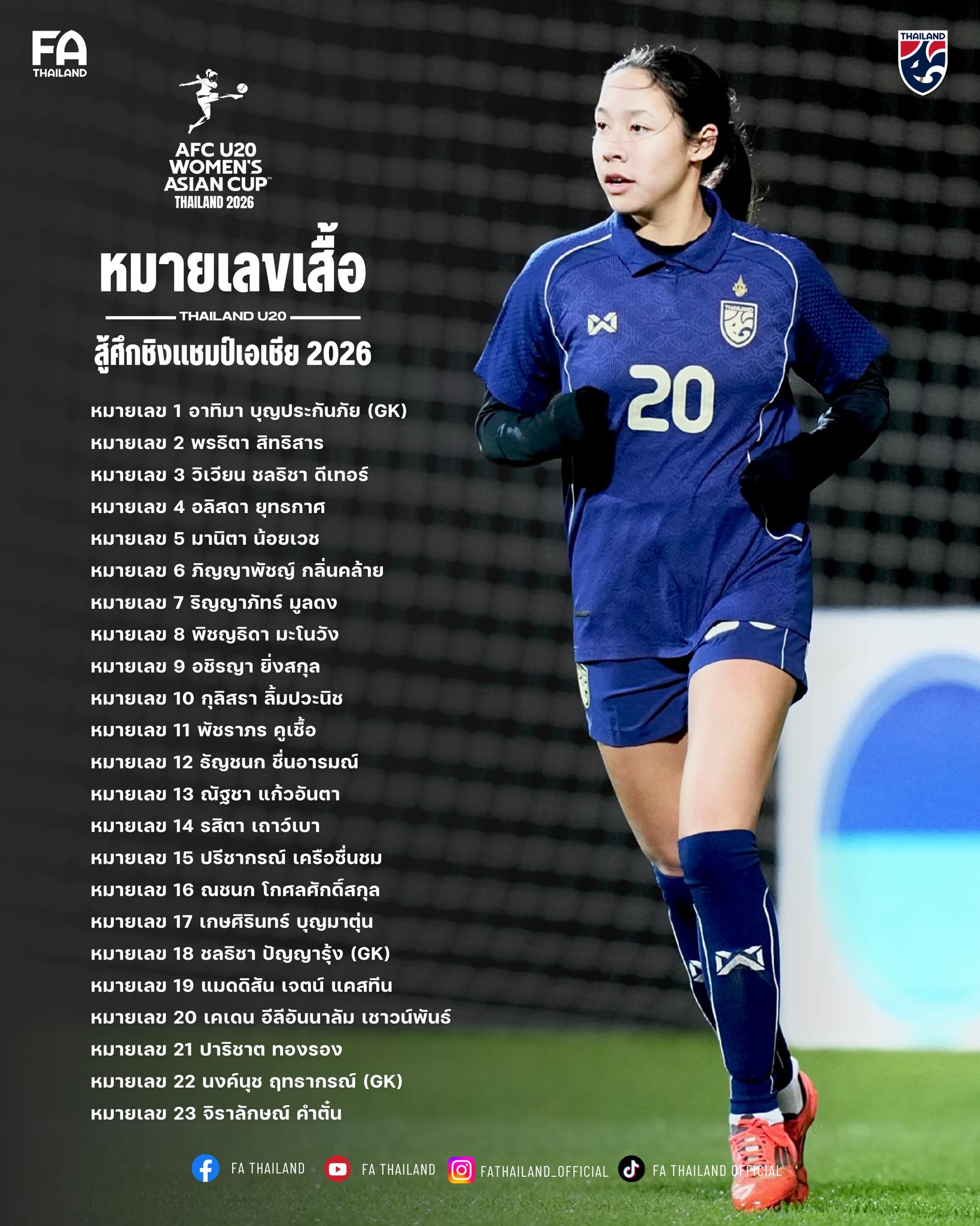 ฟุตบอลหญิงทีมชาติไทย รุ่นอายุไม่เกิน 20 ปี ประกาศหมายเลขเสื้อ นักกีฬาทั้ง 23 คน ที่จะทำการแข่งขันฟุตบอลหญิงชิงแชมป์เอเชีย รุ่นอายุไม่เกิน 20 ปี 2026 (AFC U20 Women’s Asian Cup Thailand 2026) ระหว่างวันที่ 1-18 เมษายน 2569 ณ ธรรมศาสตร์ สเตเดียม จังหวัดปทุมธานี