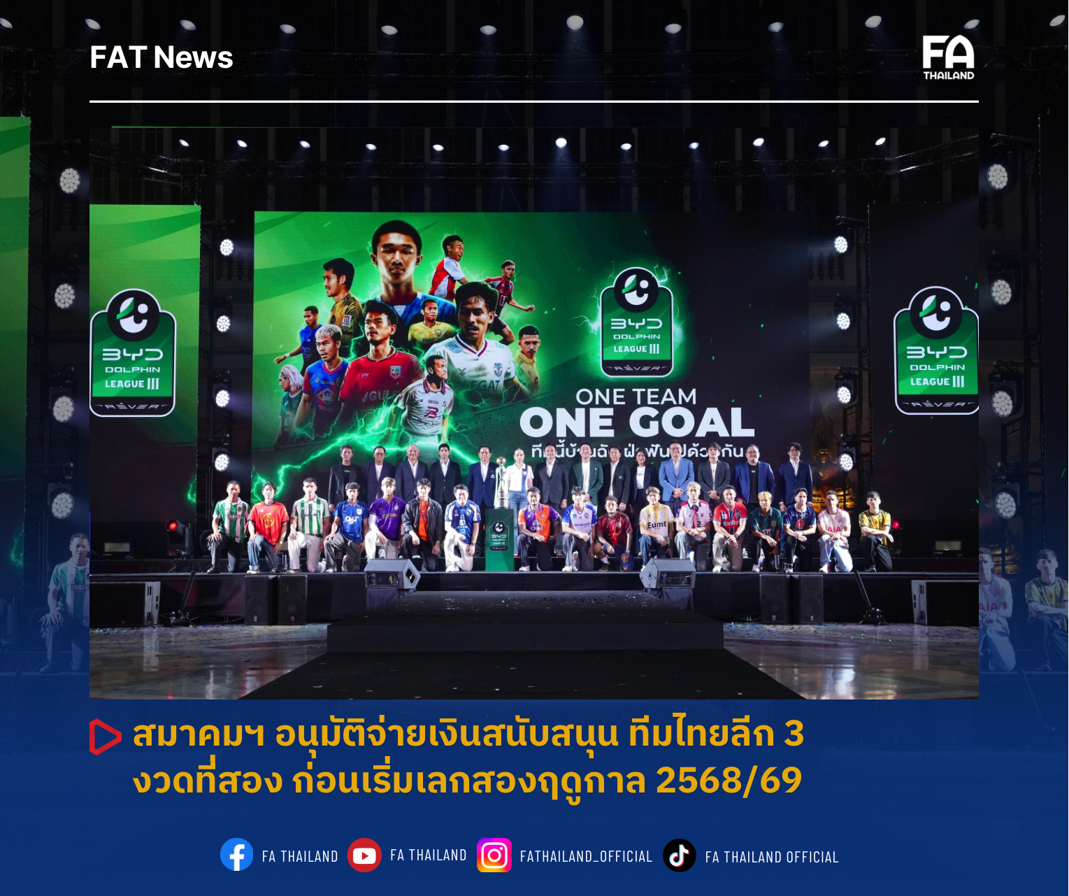 “มาดามแป้ง” นวลพรรณ ล่ำซำ นายกสมาคมกีฬาฟุตบอลแห่งประเทศไทยฯ อนุมัติการจ่ายเงินสนับสนุน งวดที่สอง ให้กับสโมสรสมาชิกในศึก BYD DOLPHIN ลีกสาม (ที่ไม่ติดข้อพิพาท) ก่อนเริ่มการแข่งขันในเลกที่สองของฤดูกาล 2568/69 ในวันที่ 1 ธันวาคม 2568