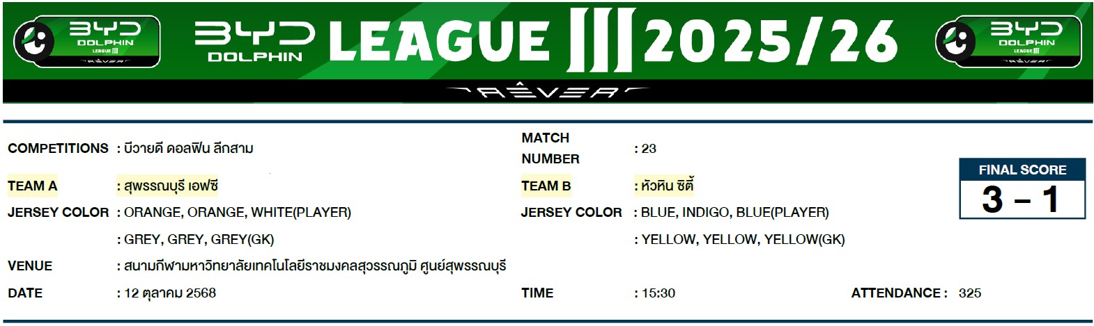 6. การแข่งขันกีฬาฟุตบอลลีกอาชีพรายการบีวายดี ดอลฟิน ลีกสาม วันที่ 12 ตุลาคม 2568 คู่ระหว่างสโมสรสุพรรณบุรี เอฟซี พบ สโมสรหัวหิน ซิตี้