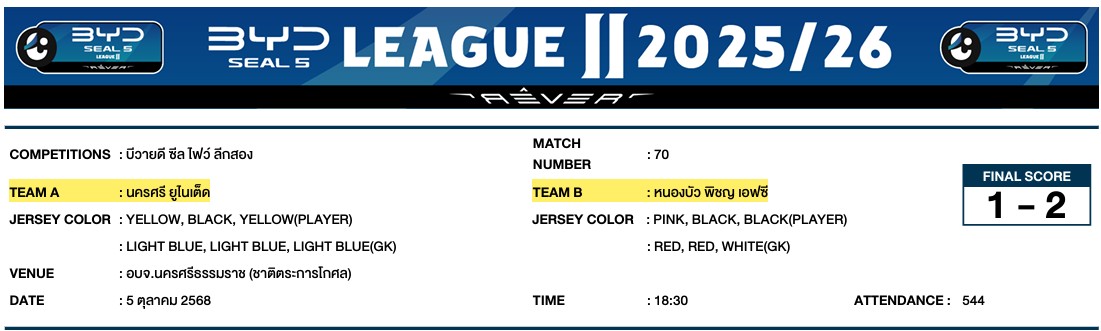 1. การแข่งขันกีฬาฟุตบอลลีกอาชีพรายการบีวายดี ซีล ไฟว์ ลีกสอง วันที่ 5 ตุลาคม 2568 คู่ระหว่างสโมสรนครศรี ยูไนเต็ด พบ สโมสรหนองบัว พิชญ เอฟซี (สโมสรนครศรี ยูไนเต็ด ร้องเรียนมา 1 เหตุการณ์)