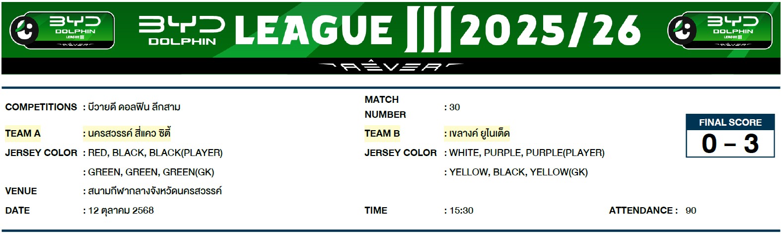 8. การแข่งขันกีฬาฟุตบอลลีกอาชีพรายการบีวายดี ดอลฟิน ลีกสาม วันที่ 12 ตุลาคม 2568 คู่ระหว่างสโมสรนครสวรรค์ สี่แคว ซิตี้ พบ สโมสรเขลางค์ ยูไนเต็ด