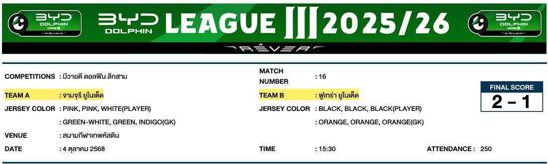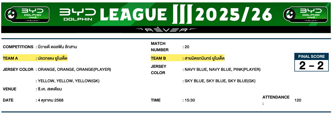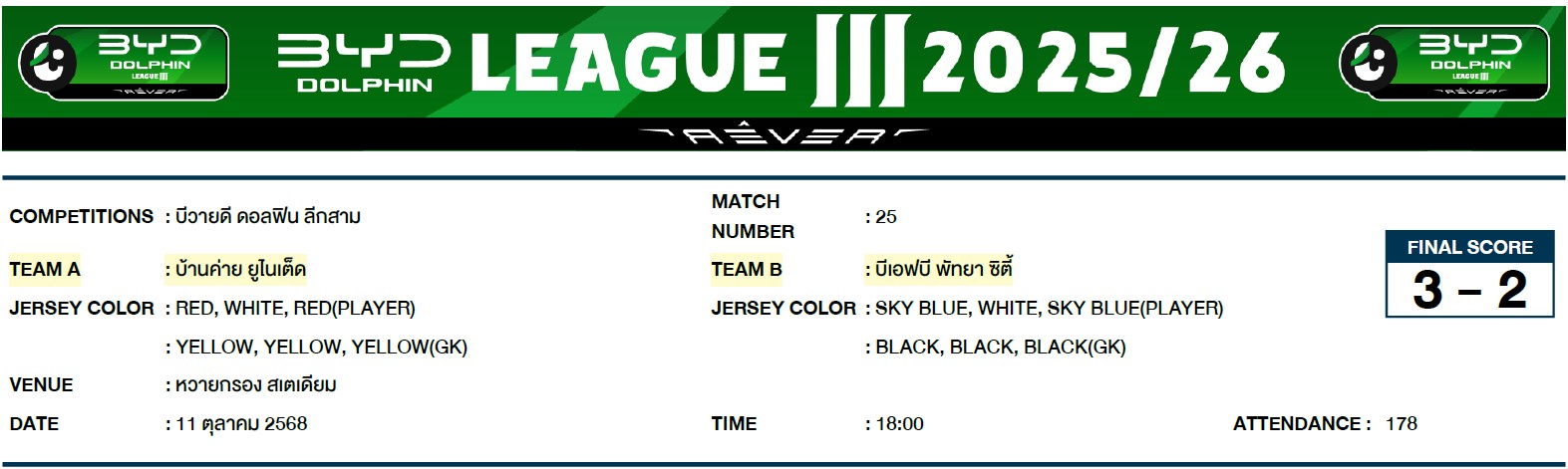 5. การแข่งขันกีฬาฟุตบอลลีกอาชีพรายการบีวายดี ดอลฟิน ลีกสาม วันที่ 11 ตุลาคม 2568 คู่ระหว่างสโมสรบ้านค่าย ยูไนเต็ด พบ สโมสรบีเอฟบี พัทยา ซิตี้ 3 เหตุการณ์