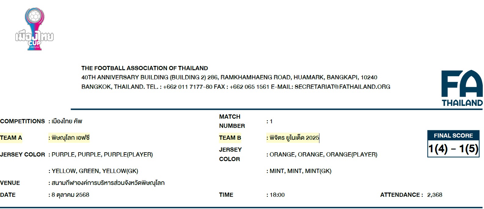 4. การแข่งขันกีฬาฟุตบอลรายการ เมืองไทย คัพ วันที่ 8 ตุลาคม 2568 คู่ระหว่างสโมสรพิษณุโลก เอฟซี พบ สโมสรพิจิตร ยูไนเต็ด 2025