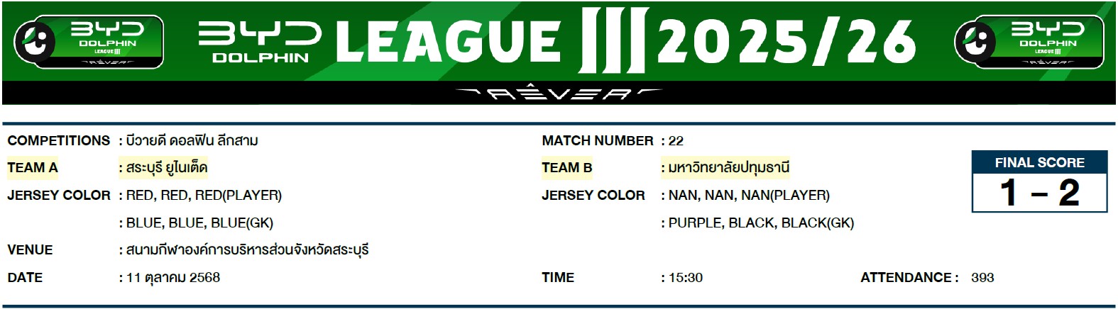 7. การแข่งขันกีฬาฟุตบอลลีกอาชีพรายการบีวายดี ดอลฟิน ลีกสาม วันที่ 11 ตุลาคม 2568 คู่ระหว่างสโมสรสระบุรี ยูไนเต็ด พบ สโมสรมหาวิทยาลัยปทุมธานี