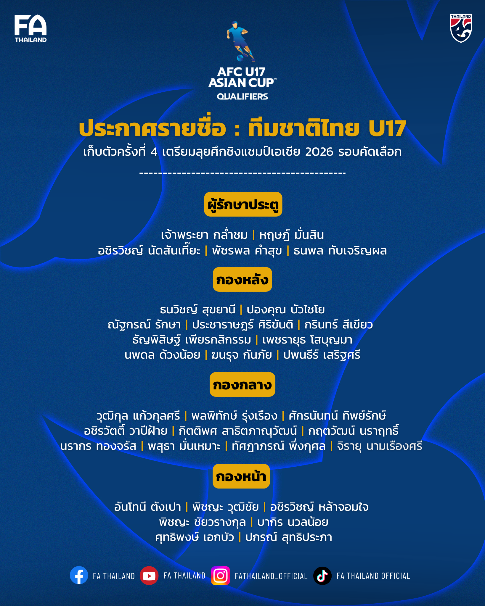 สมาคมกีฬาฟุตบอลแห่งประเทศไทย ในพระบรมราชูปถัมภ์ ประกาศรายชื่อ 32 นักฟุตบอลชายทีมชาติไทย รุ่นอายุไม่เกิน 17 ปี เก็บตัวฝึกซ้อม เพื่อเตรียมความพร้อมก่อนทำการแข่งขันฟุตบอลชายชิงแชมป์เอเชียรุ่นอายุไม่เกิน 17 ปี รอบคัดเลือก (AFC U17 Asian Cup Saudi Arabia 2026 Qualifiers) ระหว่างวันที่ 22-30 พฤศจิกายน 2568