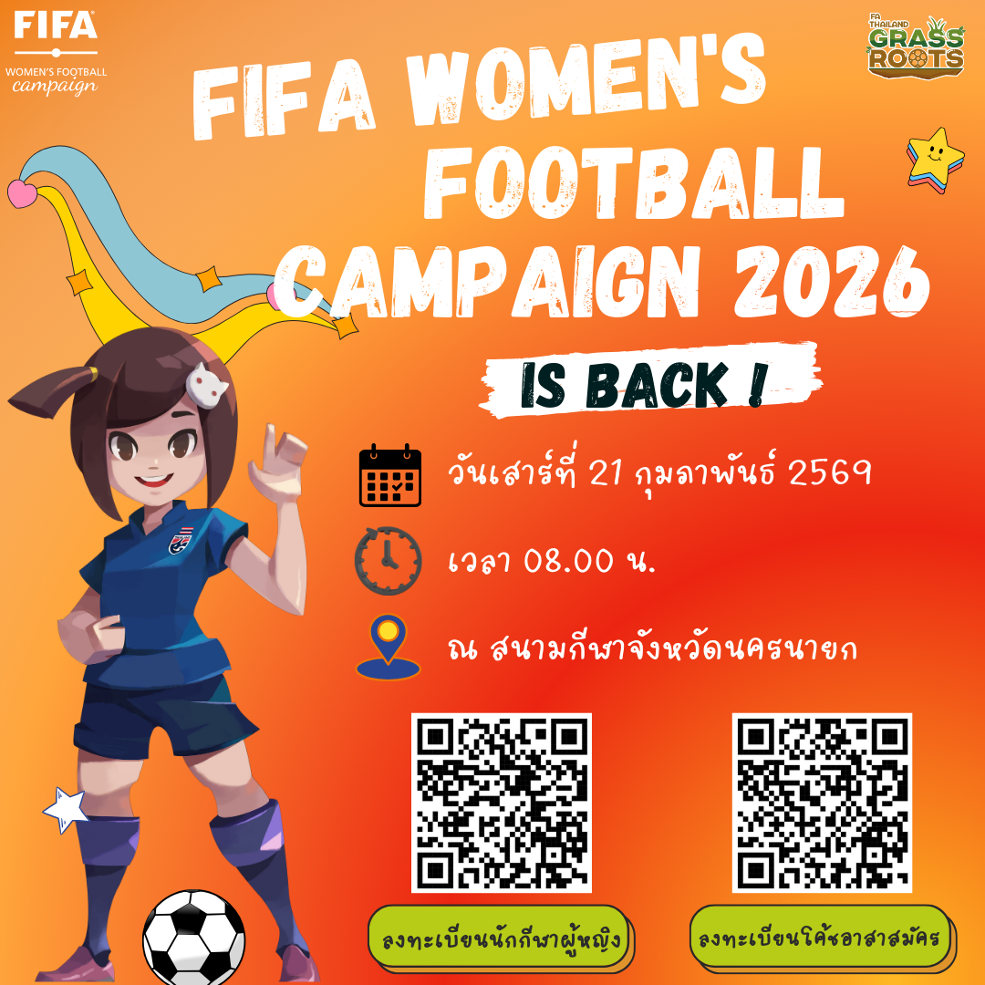 ประกาศรับสมัคร : เยาวชนหญิง และโค้ชอาสาสมัคร ร่วมกิจกรรม FIFA Women's Football Campaign 2026 ที่ นครนายก
